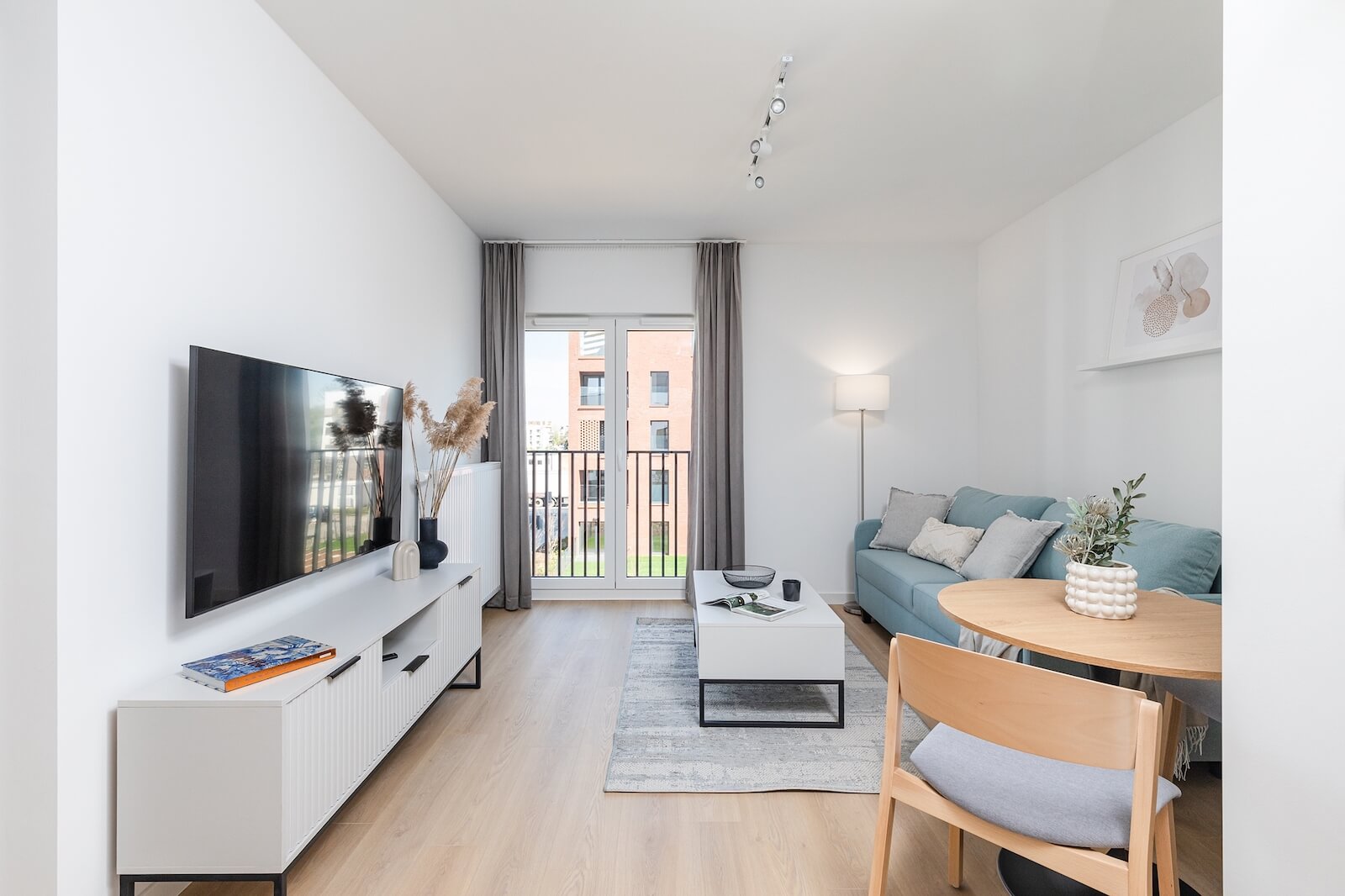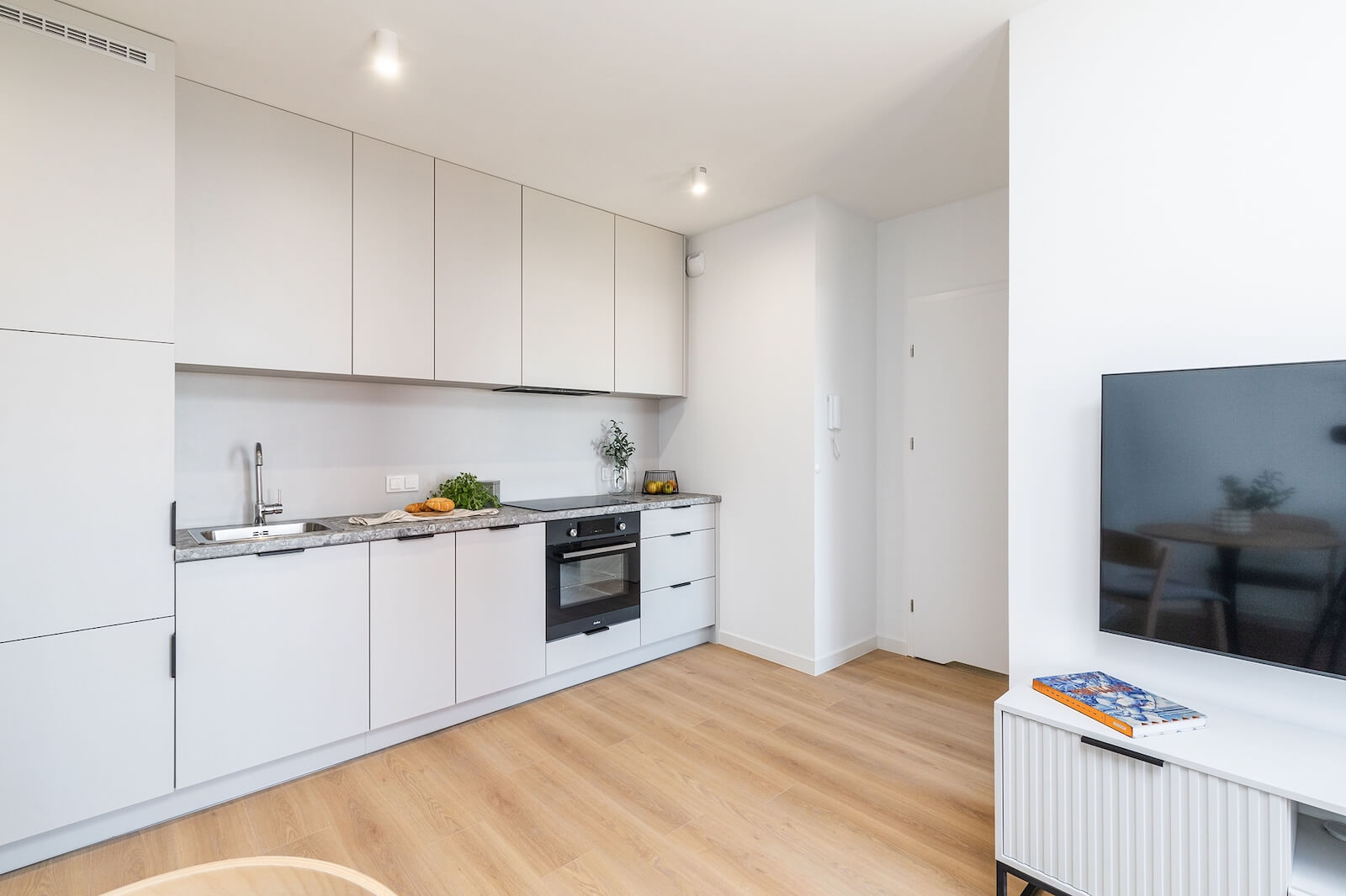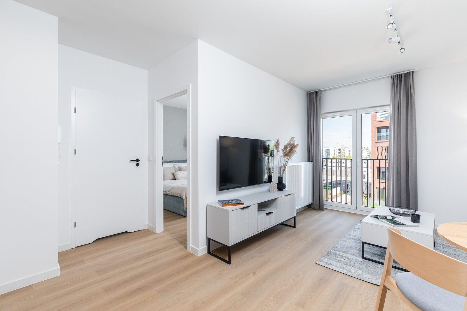 This 1-bedroom apartment is perfect for couples or remote workers. With a spacious living room and kitchenette, separate bedroom, and balcony, it offers both comfort and practicality. Modern appliances, a TV, and smart storage options are all included.