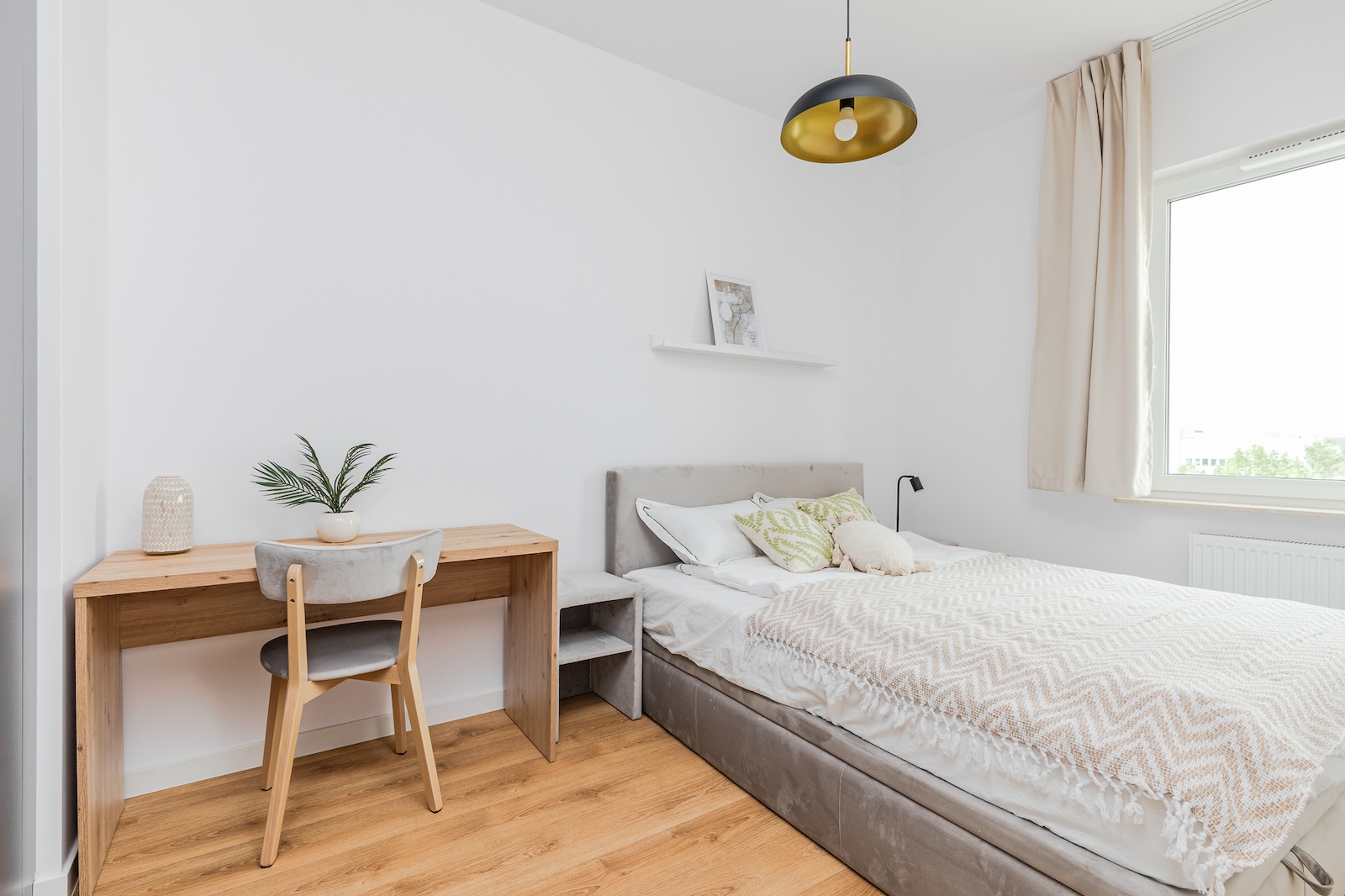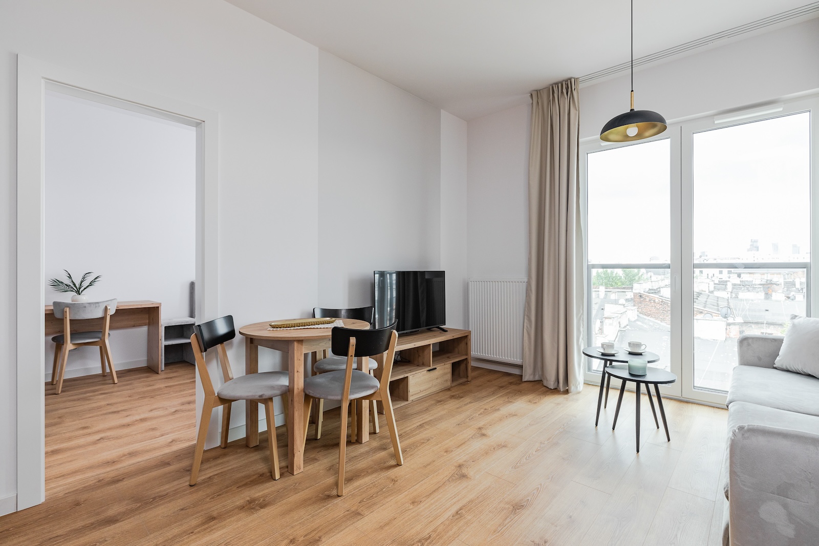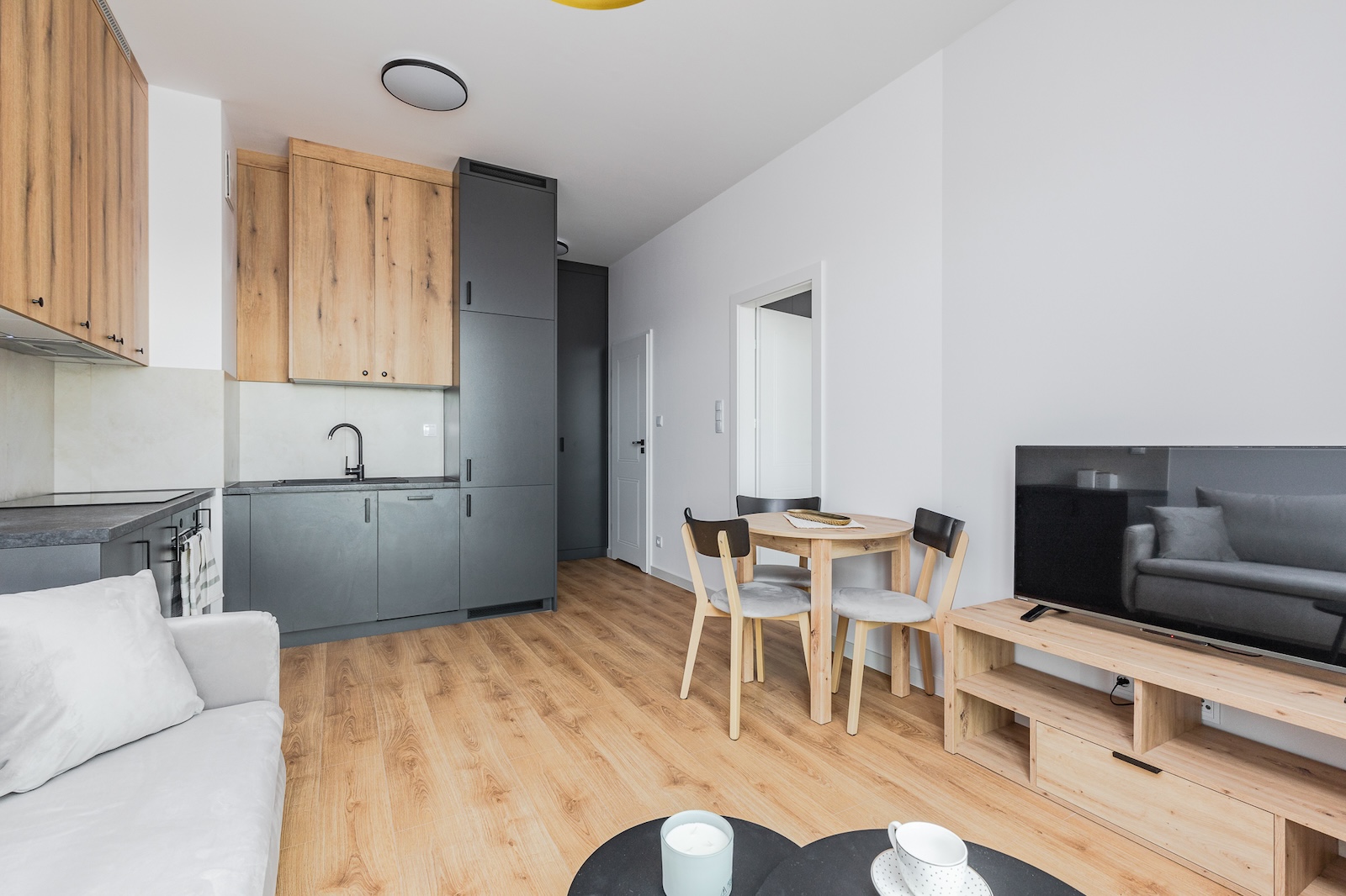 1-bedroom apartment has clearly separated sleeping and living areas for comfortable everyday use. Large windows let in natural light, and the balcony adds extra space during the warmer months. The kitchen is equipped with modern appliances: oven, hob, fridge-freezer, and dishwasher. The bathroom features a shower, storage space, and a washing machine. The apartment includes storage options and if more space is needed, basement storage units are available for rent. Natural-looking laminate flooring and neutral tones create a cozy vibe. A TV is also provided in the living area. Smoking is not allowed inside, on balconies, or anywhere in the building – a designated smoking area is located outside.