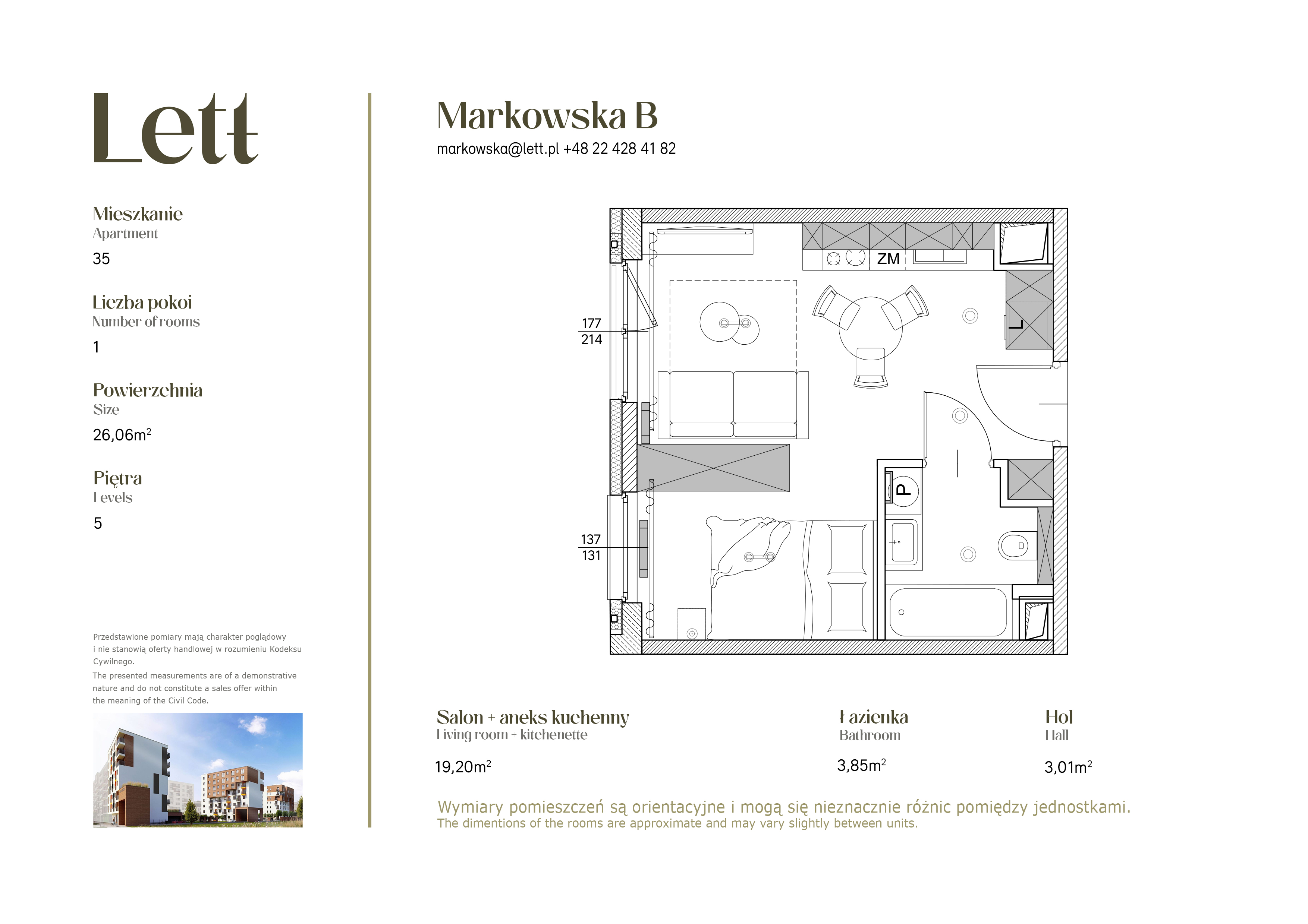 This apartment is located in the Lett Markowska development and offers a modern space to live – perfect for both short and long stays. At 5 Markowska Street, there are 179 fully furnished studios and one-bedroom apartments ready to move in.