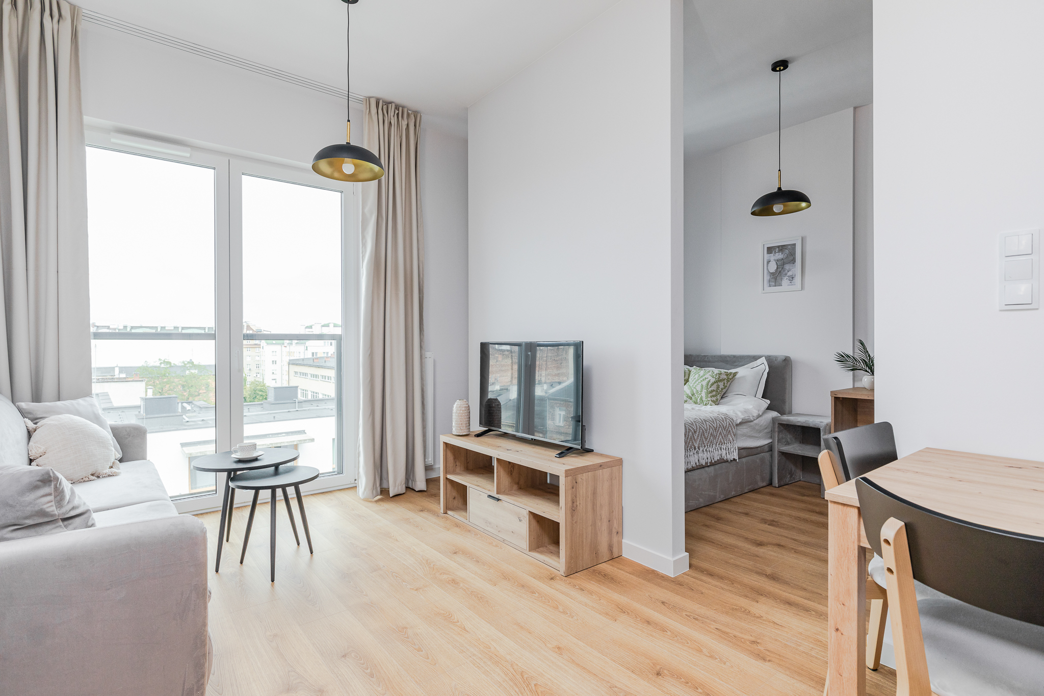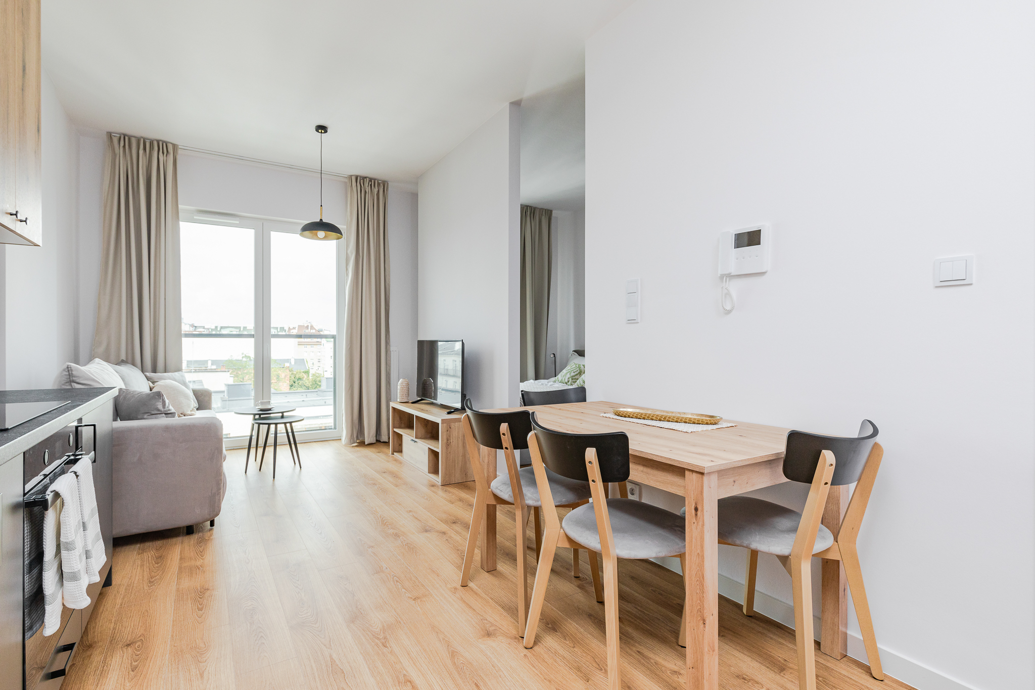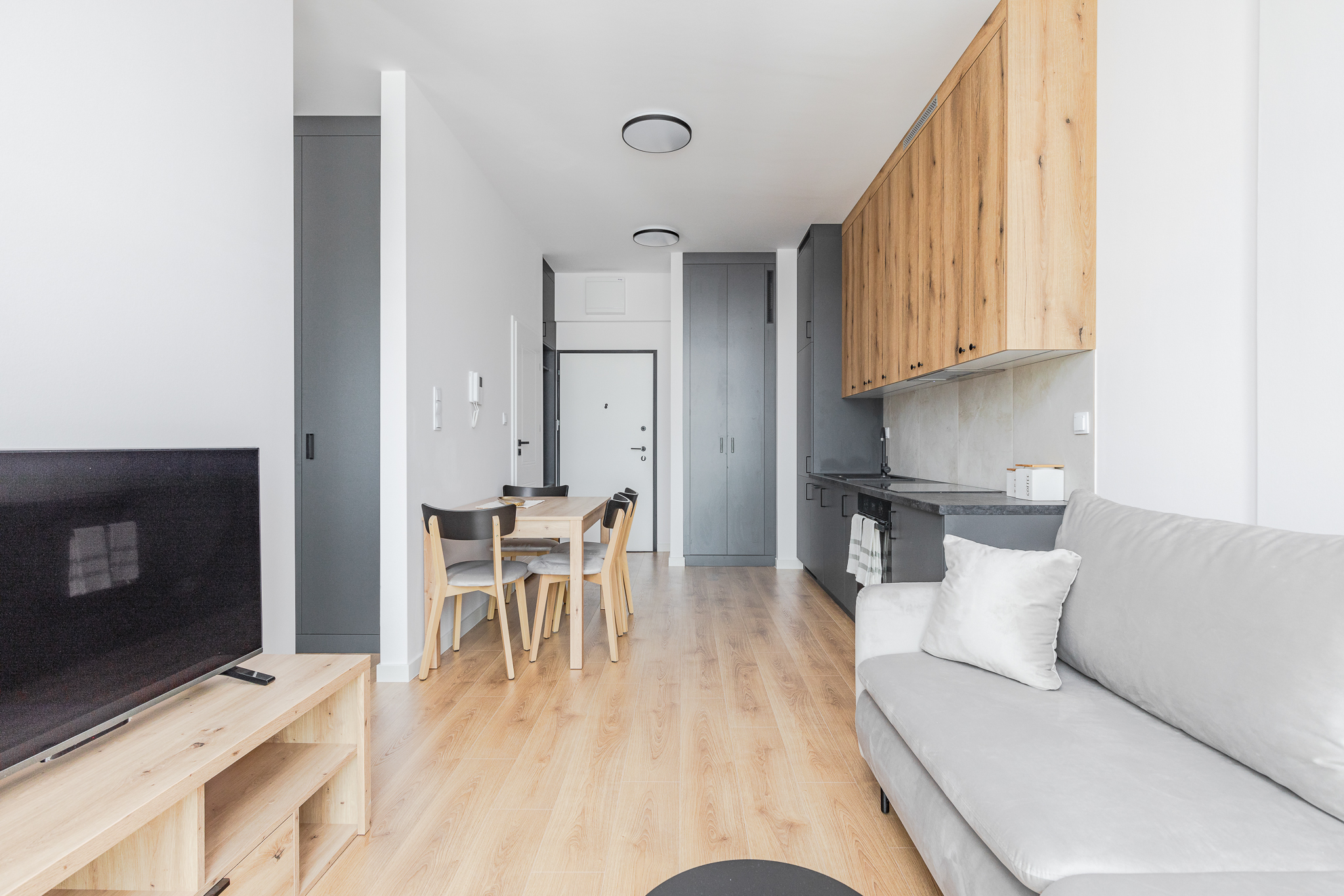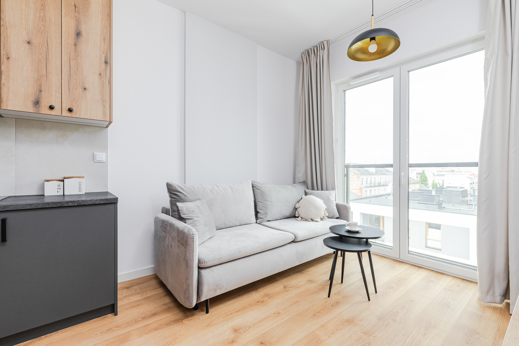 This apartment is located in the Lett Markowska development and offers a modern space to live – perfect for both short and long stays. At 5 Markowska Street, there are 179 fully furnished studios and one-bedroom apartments ready to move in.