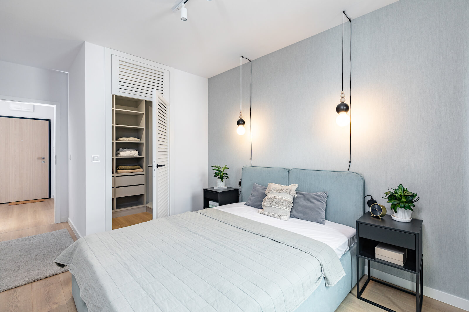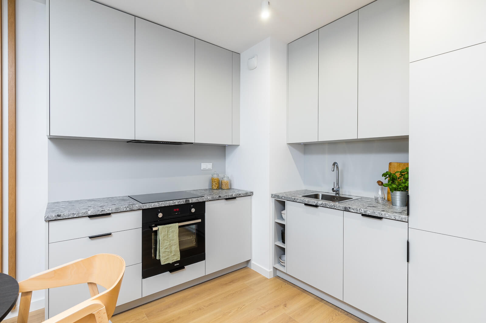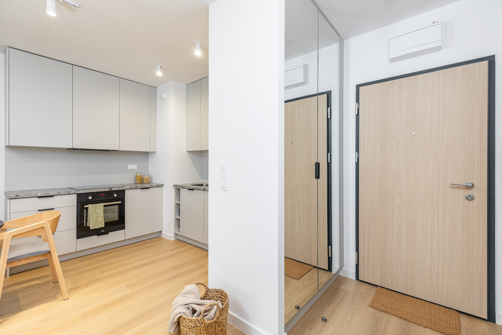 2 pokojowy apartament, posiada wydzieloną strefę sypialnianą z garderobą oraz część dzienną z otwartą kuchnią, co wpływa na wygodne korzystanie z przestrzeni. Duże okna wpuszczają do wnętrza sporą ilość naturalnego światła, a w okresie letnim przyjemne chwile na świeżym powietrzu zapewni balkon.