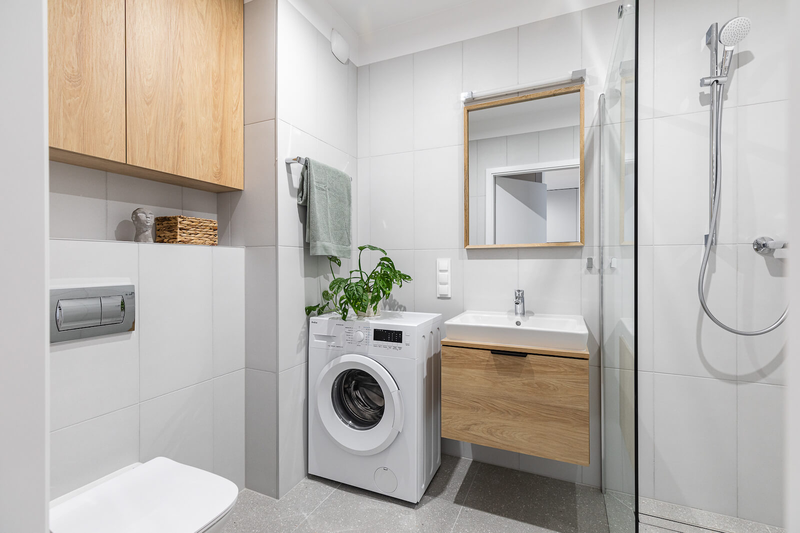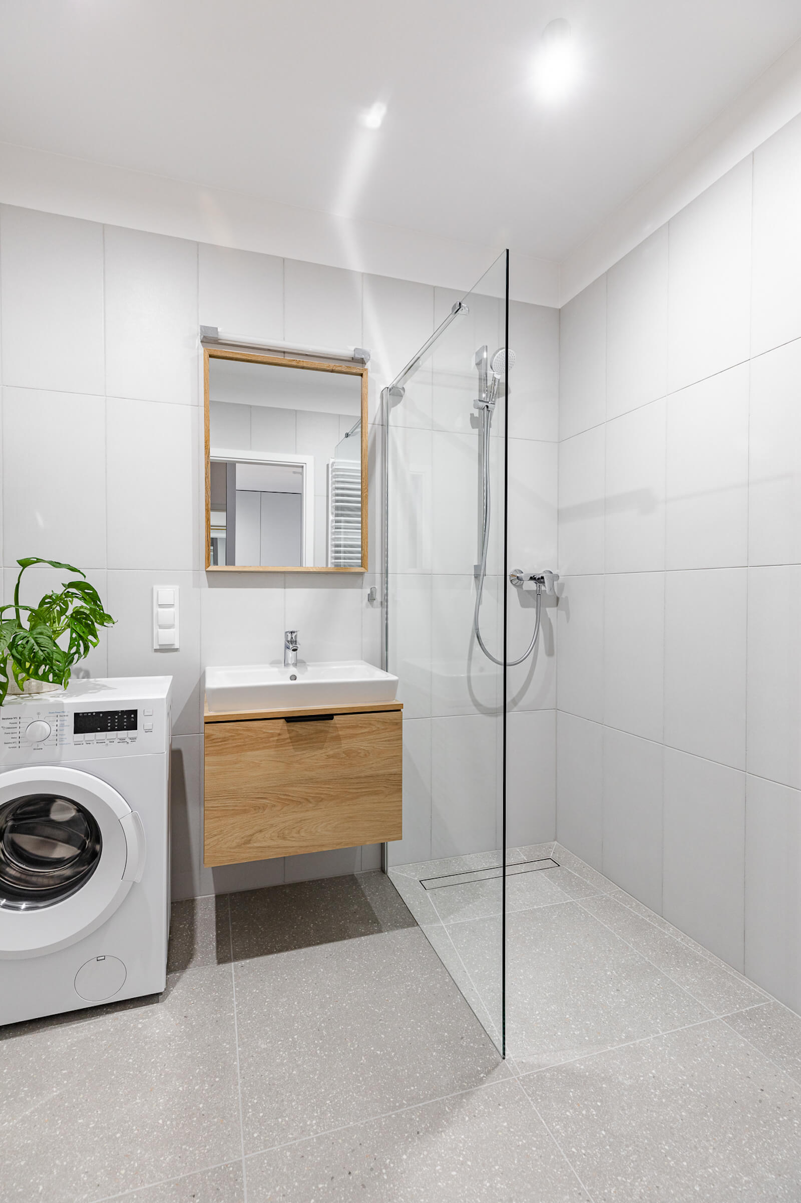 Kuchnia urządzona jest w nowoczesnym stylu z zestawem szarych szafek i kamiennym blatem. Wyposażenie obejmuje wysokiej jakości sprzęt AGD (piekarnik, kuchenka, lodówka z zamrażarką, zmywarka), który sprawia, że gotowanie staje się przyjemnością. W podobnej stylistyce wykończono łazienkę, gdzie znajdziemy prysznic i pojemne schowki. Umieszczono tu również pralkę.