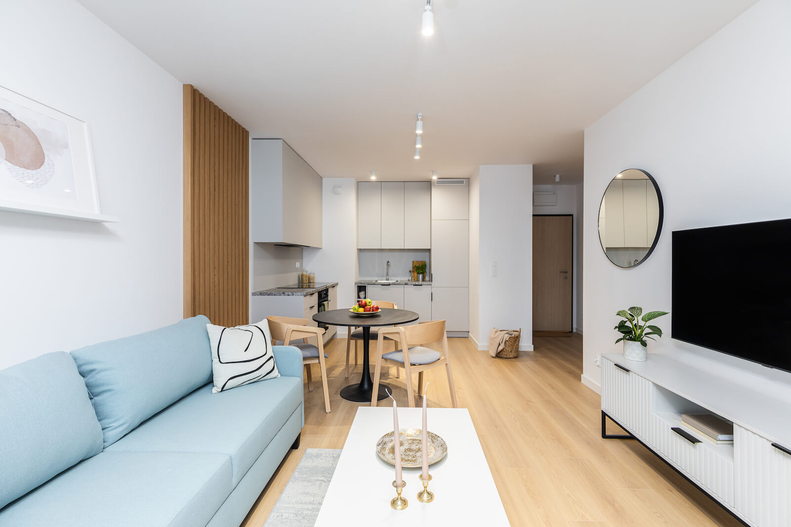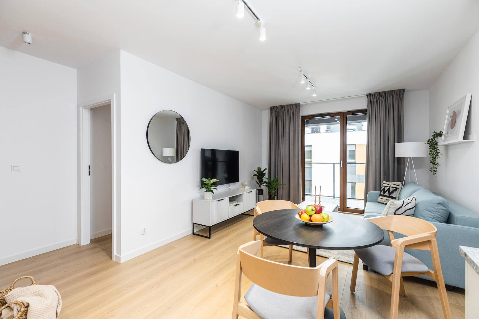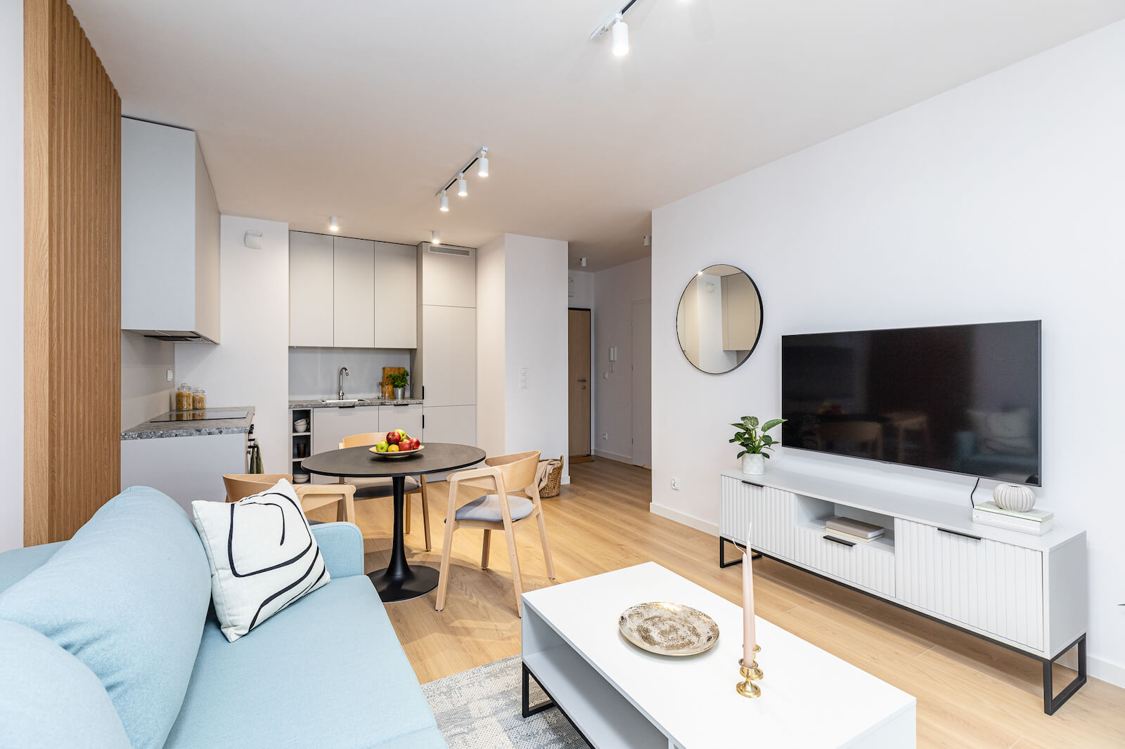 W idealnym do odpoczynku salonie znajduje się również TV. Dbamy o naszych mieszkańców, dlatego palenie jest zabronione w mieszkaniach, na balkonach oraz na terenie całego budynku. Strefa dla palących została wydzielona na zewnątrz.