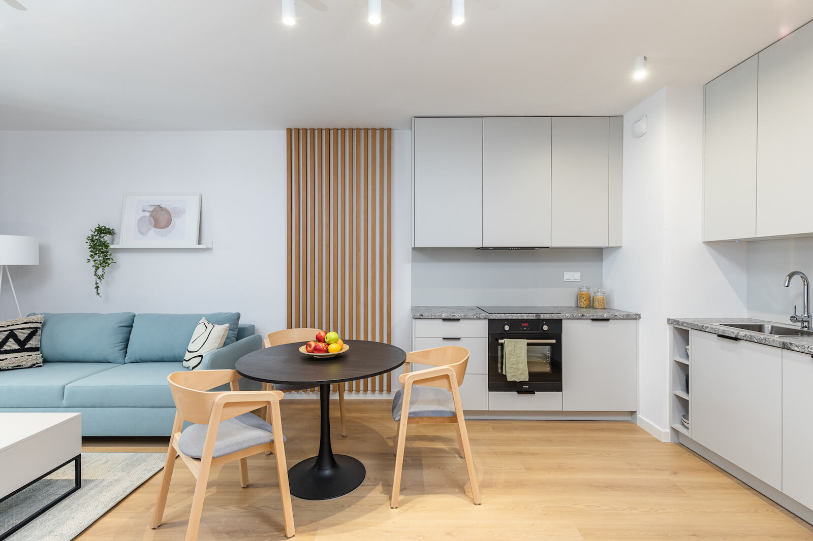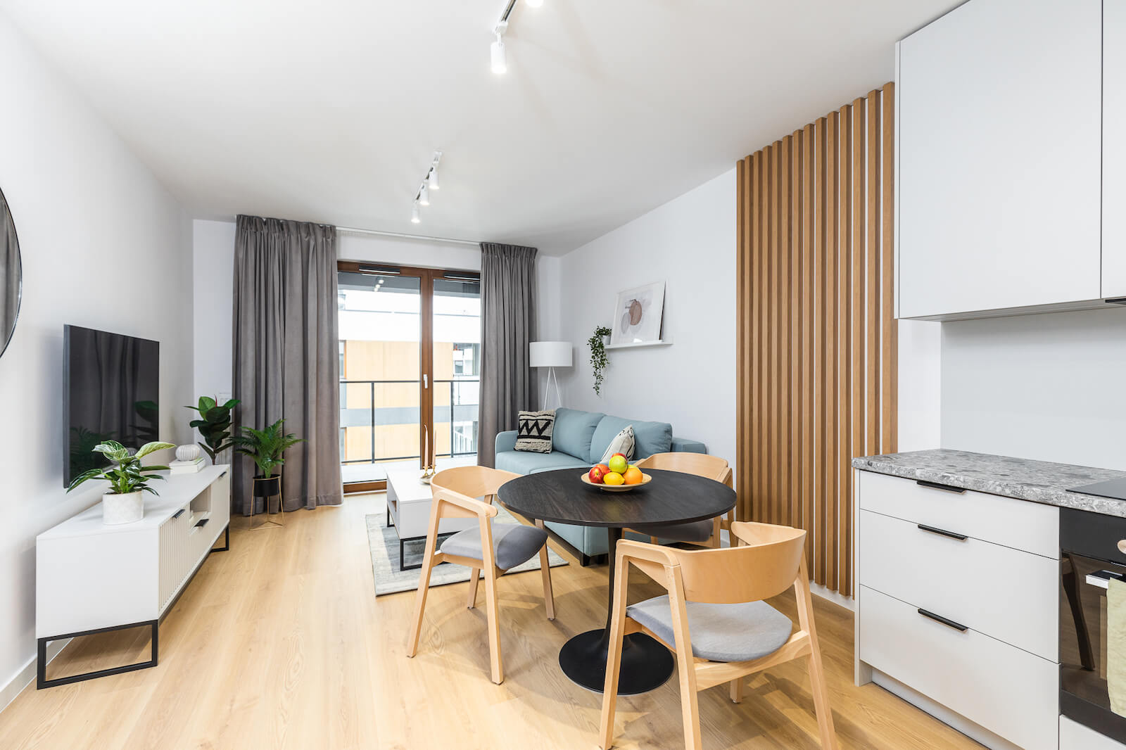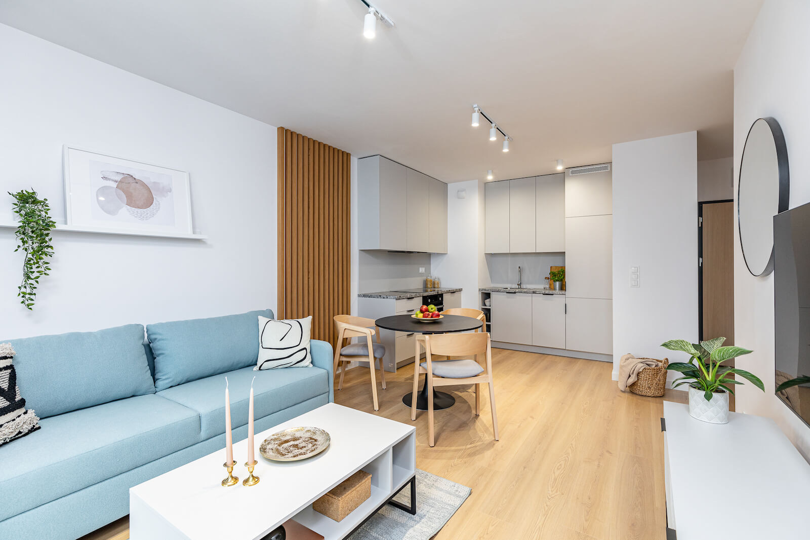 W idealnym do odpoczynku salonie znajduje się również TV. Dbamy o naszych mieszkańców, dlatego palenie jest zabronione w mieszkaniach, na balkonach oraz na terenie całego budynku. Strefa dla palących została wydzielona na zewnątrz.