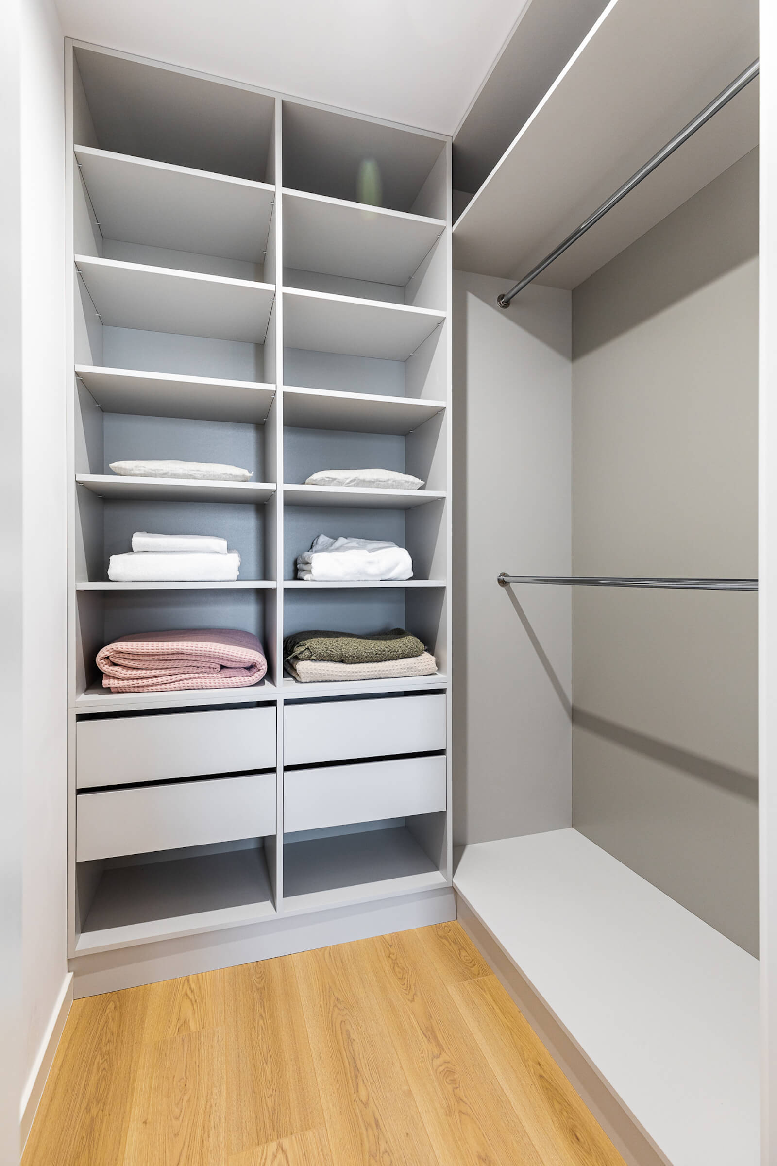 W mieszkaniu przewidziano miejsce na przechowywanie rzeczy osobistych, a w przypadku większych potrzeb, możesz łatwo wynająć dodatkową przestrzeń w piwnicy. Podłoga w mieszkaniu wykonana jest z naturalnie wyglądającego laminatu, a białe ściany w połączeniu z meblami tworzą przytulny efekt.