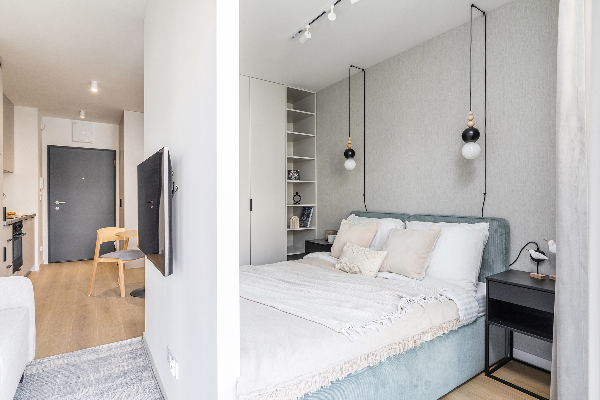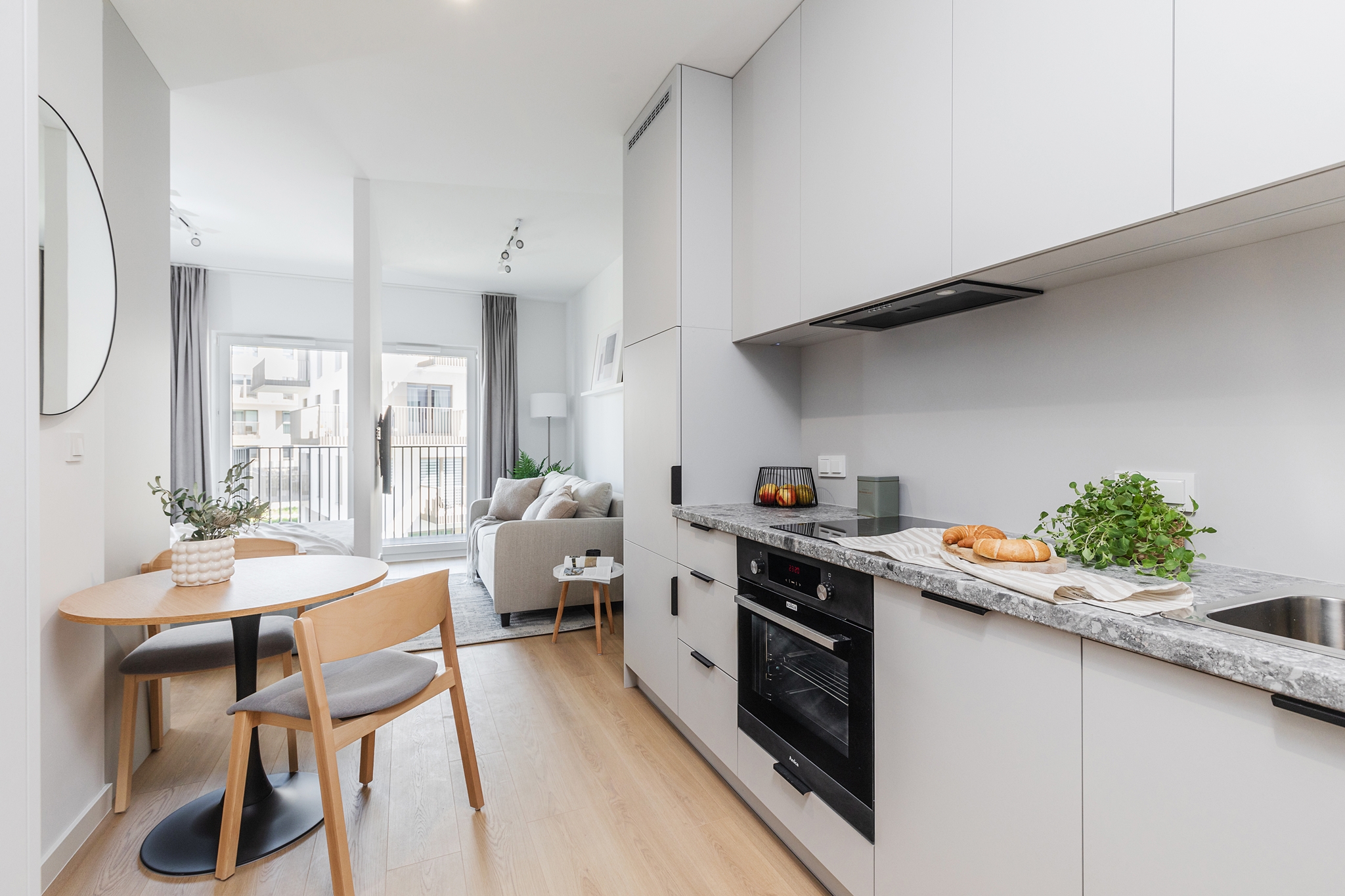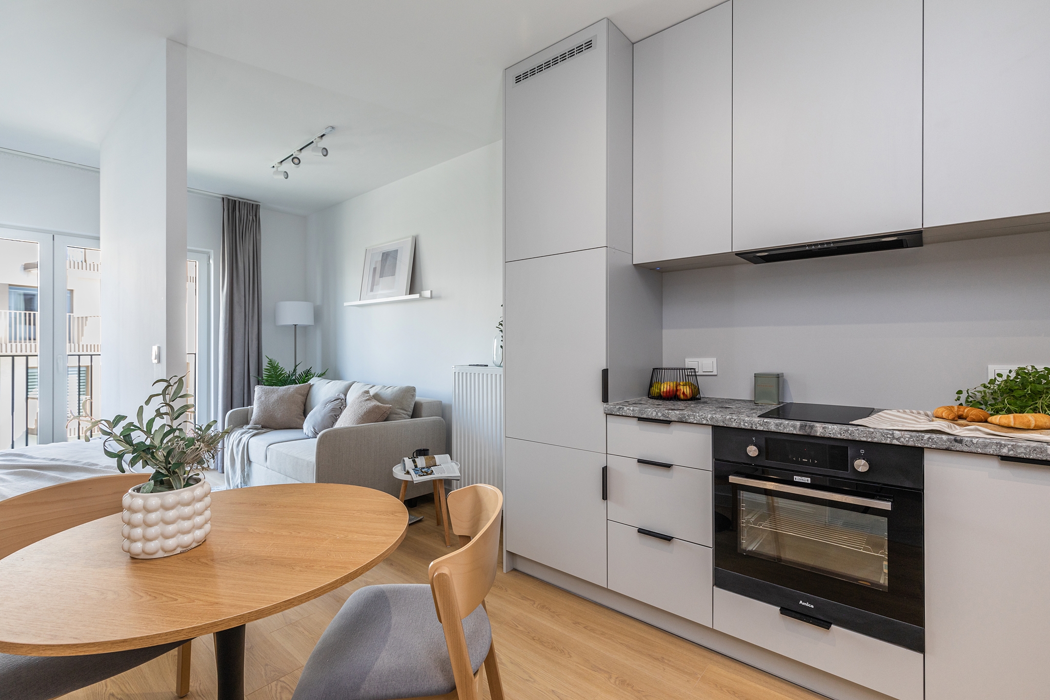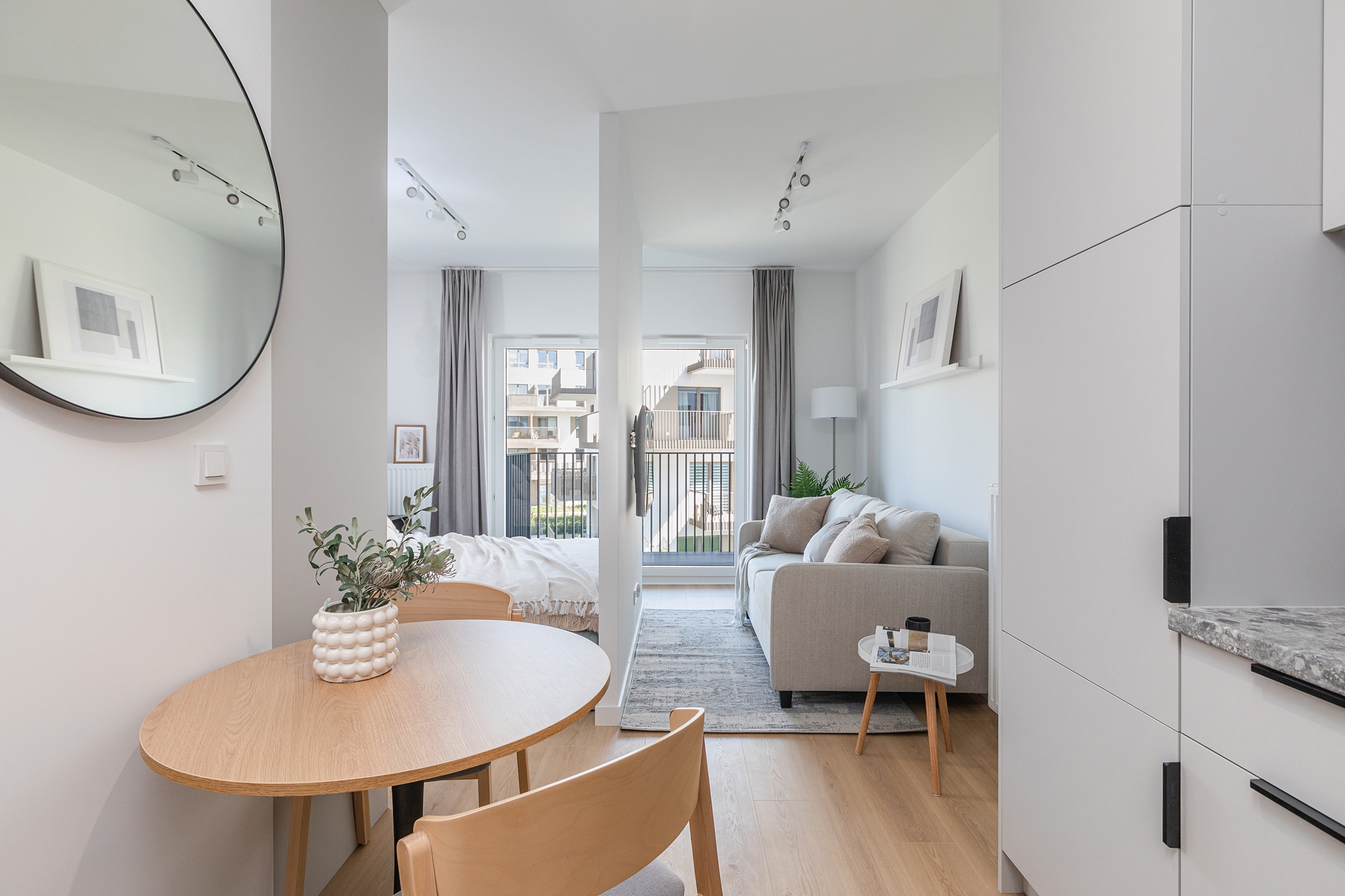 Studio w Lett Lazurowa to idealna propozycja dla singli lub osób szukających kompaktowego, ale wygodnego miejsca do życia. Mieszkanie posiada wyraźnie wydzieloną strefę dzienną i sypialnianą, a duże okna wpuszczają dużo naturalnego światła. W cieplejsze dni do dyspozycji jest również balkon. Kuchnia wyposażona jest w nowoczesne AGD (piekarnik, płyta, lodówka z zamrażarką, zmywarka), a w łazience znajduje się prysznic, pralka i zabudowane szafki. Podłoga z naturalnie wyglądającego laminatu oraz jasna kolorystyka wnętrz zapewniają przytulny klimat.