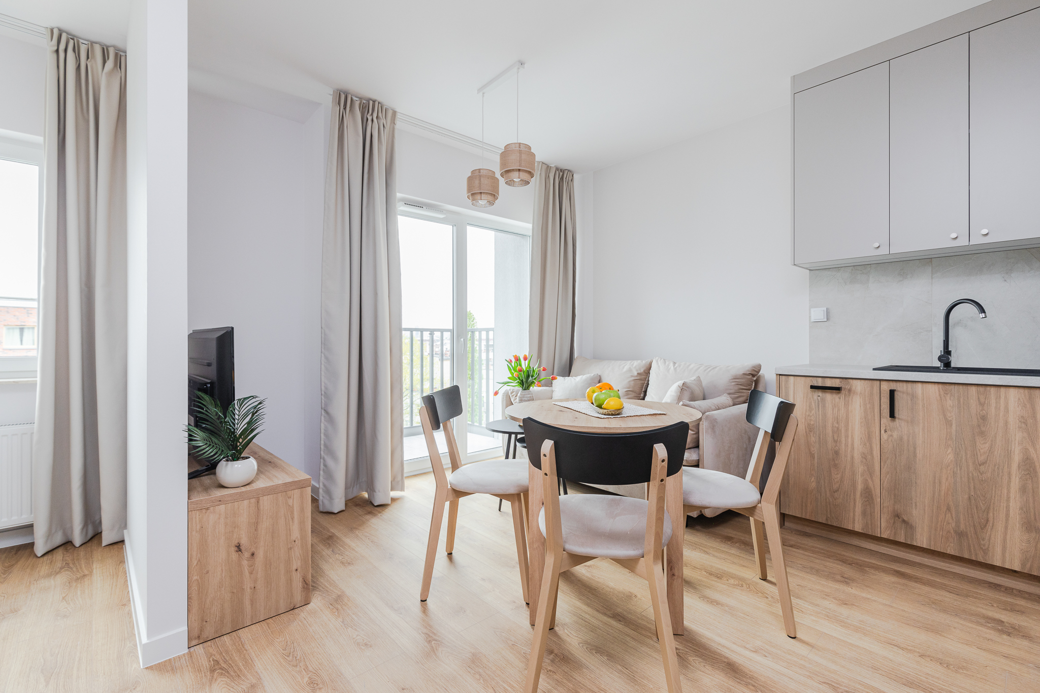 Apartament studio ze strefą sypialnianą został zaprojektowany z myślą o maksymalnym komforcie – posiada wyraźnie oddzieloną strefę dzienną oraz sypialnianą. Duże okna zapewniają dostęp do naturalnego światła, a balkon pozwala cieszyć się świeżym powietrzem w cieplejsze dni. Kuchnia w nowoczesnej zabudowie wyposażona jest w wysokiej jakości sprzęt AGD: piekarnik, płytę grzewczą, lodówkę z zamrażarką oraz zmywarkę. Przemyślany układ przestrzeni ułatwia codzienne funkcjonowanie, a w łazience znajdziesz prysznic, praktyczne schowki oraz pralkę. W mieszkaniu przewidziano miejsce na przechowywanie rzeczy osobistych, a dodatkową przestrzeń możesz łatwo wynająć w piwnicy. Drewnopodobna podłoga i jasna kolorystyka ścian tworzą przytulną atmosferę. W salonie znajduje się także telewizor. Dla komfortu i bezpieczeństwa mieszkańców, palenie jest zabronione w mieszkaniach, na balkonach oraz na terenie całego budynku. Wydzielono strefę dla palących na zewnątrz.