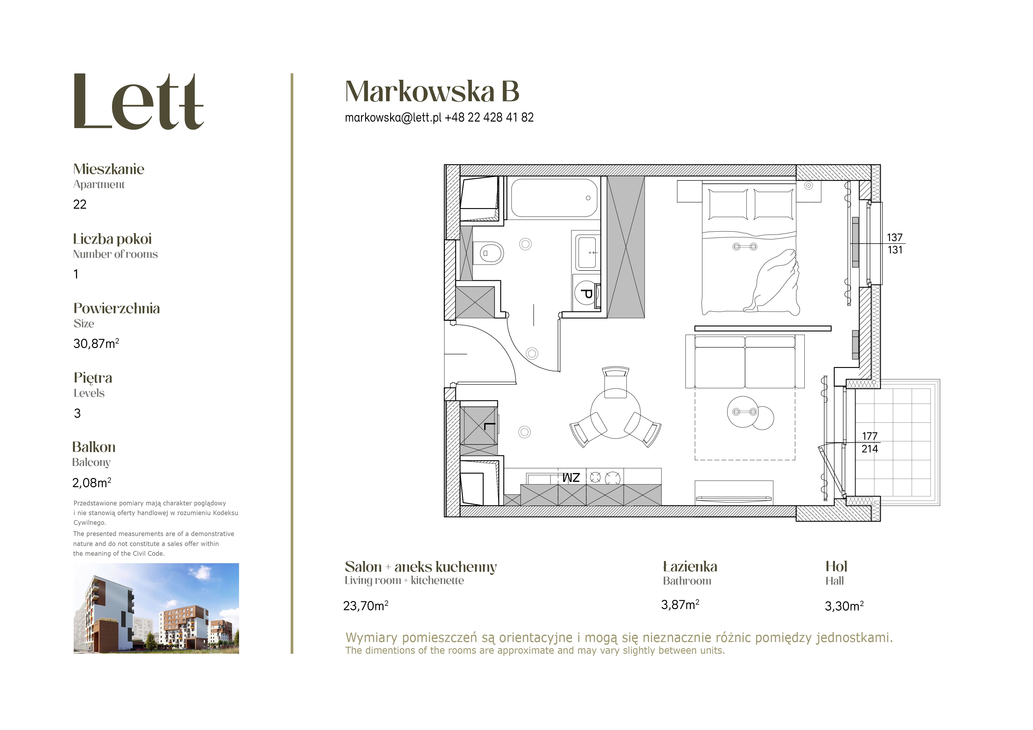 Prezentowane mieszkanie znajduje się w inwestycji Lett Markowska i oferuje nowoczesne miejsce do życia – idealne zarówno na krótki pobyt, jak i dłuższy wynajem. Przy ul. Markowskiej 5 znajduje się aż 179 mieszkań, w tym kawalerki i mieszkania dwupokojowe, w pełni umeblowane i gotowe do zamieszkania.