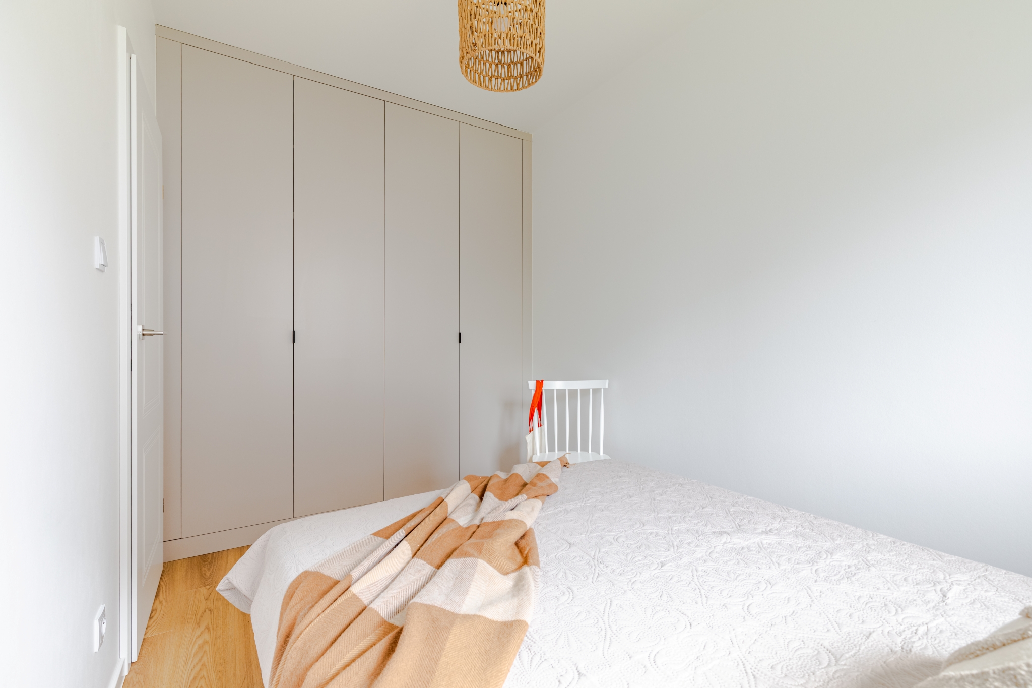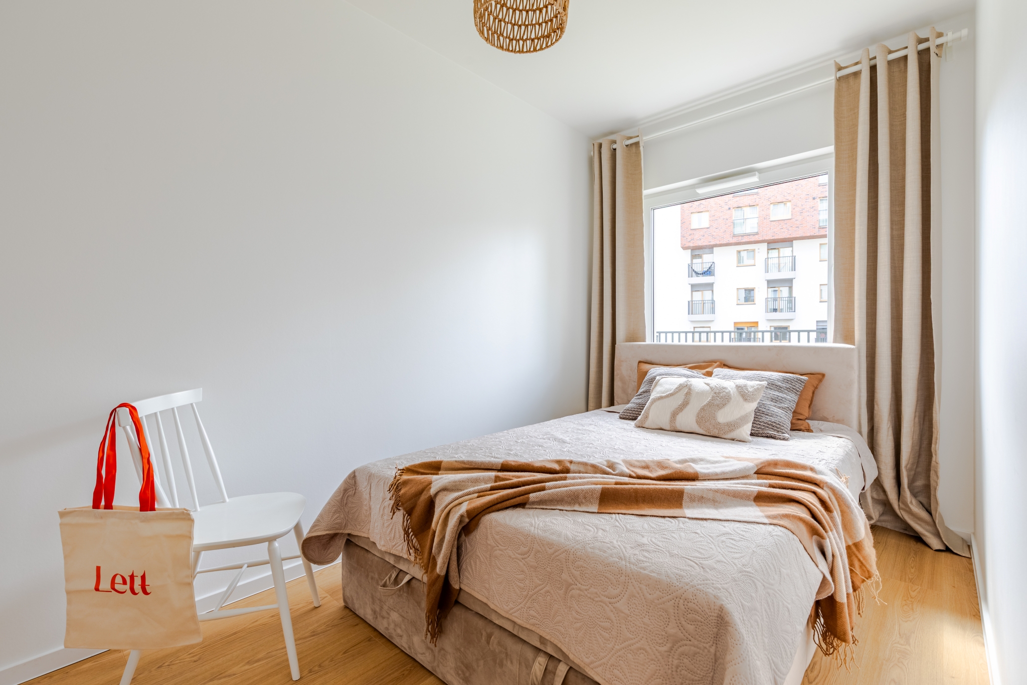 Apartament 2 pokojowy został zaprojektowany z myślą o maksymalnym komforcie – posiada wyraźnie oddzieloną strefę dzienną oraz sypialnianą. Duże okna zapewniają dostęp do naturalnego światła, a balkon pozwala cieszyć się świeżym powietrzem w cieplejsze dni. Kuchnia w nowoczesnej zabudowie wyposażona jest w wysokiej jakości sprzęt AGD: piekarnik, płytę grzewczą, lodówkę z zamrażarką oraz zmywarkę. Przemyślany układ przestrzeni ułatwia codzienne funkcjonowanie, a w łazience znajdziesz prysznic, praktyczne schowki oraz pralkę. W mieszkaniu przewidziano miejsce na przechowywanie rzeczy osobistych, a dodatkową przestrzeń możesz łatwo wynająć w piwnicy. Drewnopodobna podłoga i jasna kolorystyka ścian tworzą przytulną atmosferę. W salonie znajduje się także telewizor. Dla komfortu i bezpieczeństwa mieszkańców, palenie jest zabronione w mieszkaniach, na balkonach oraz na terenie całego budynku. Wydzielono strefę dla palących na zewnątrz.