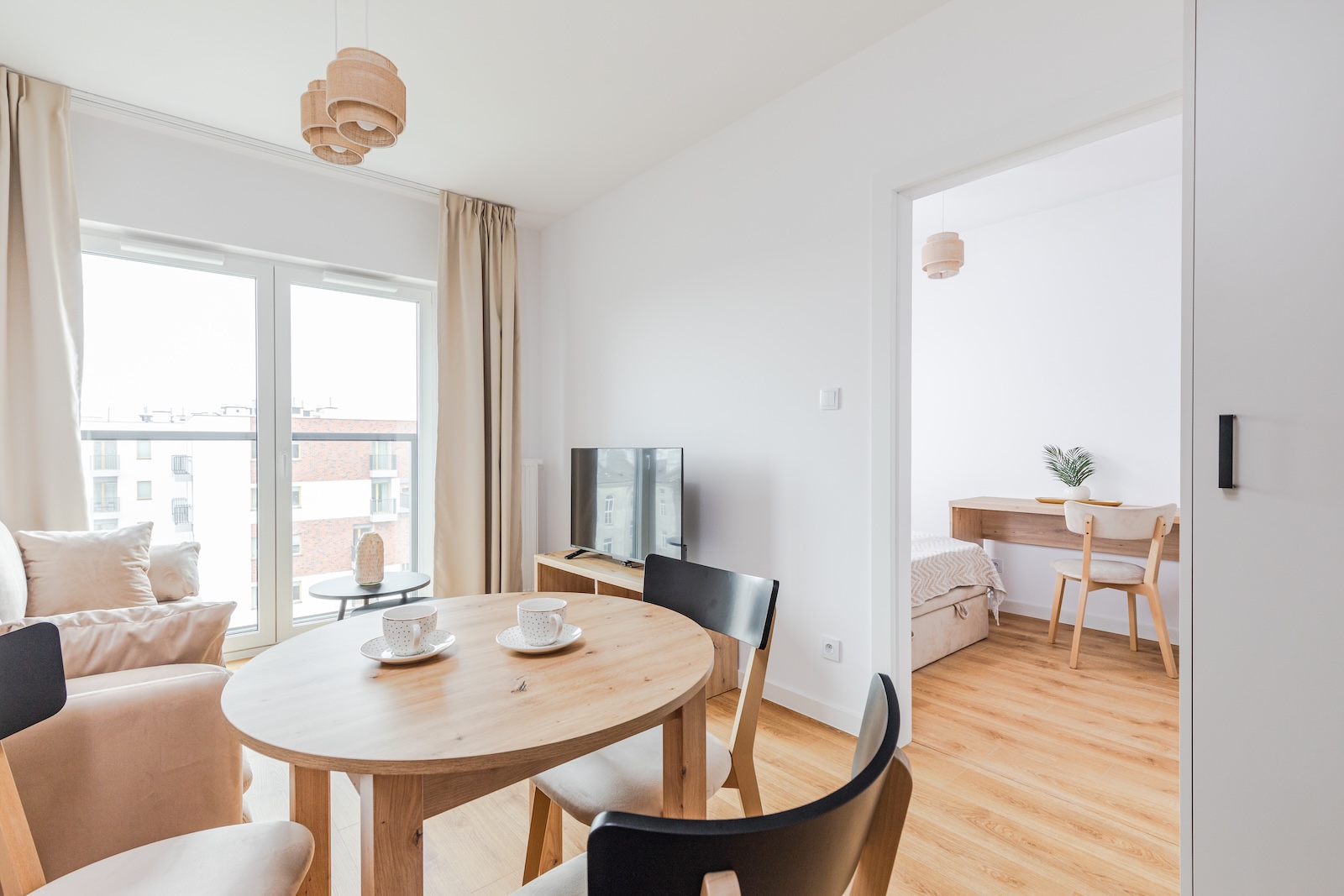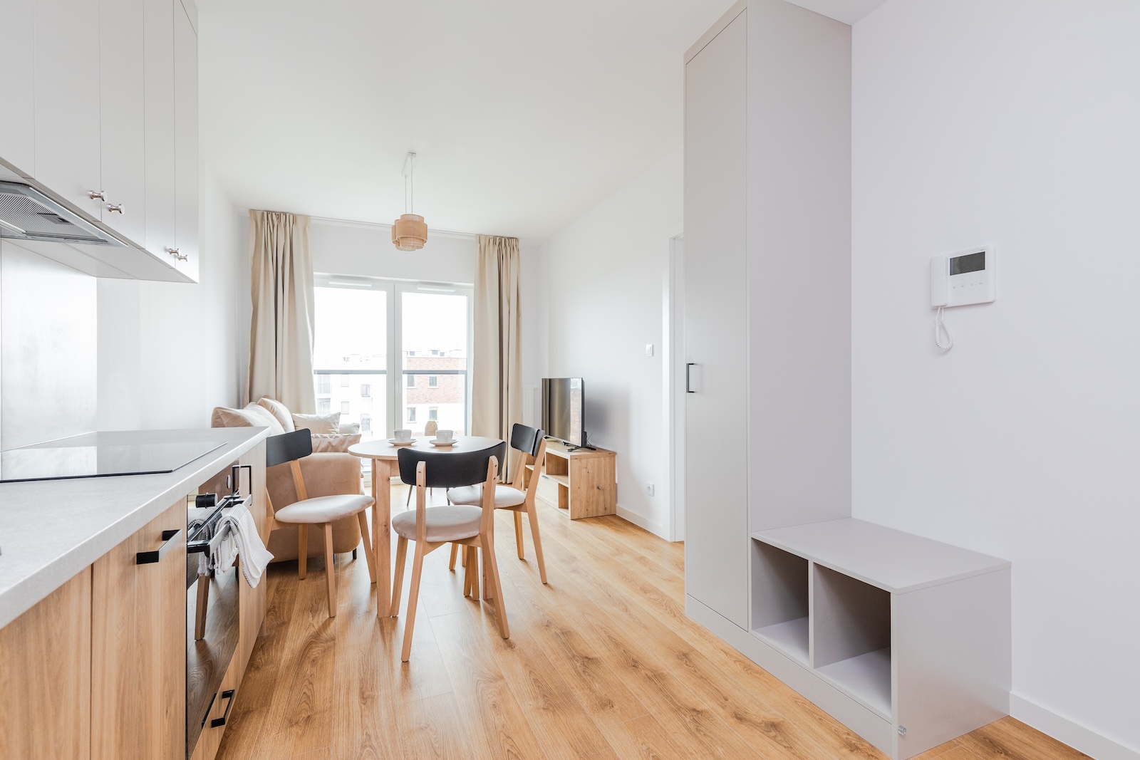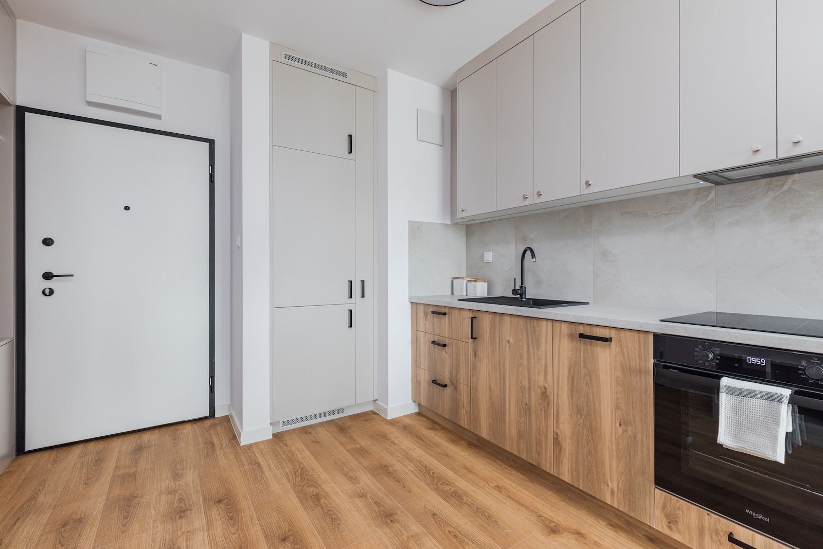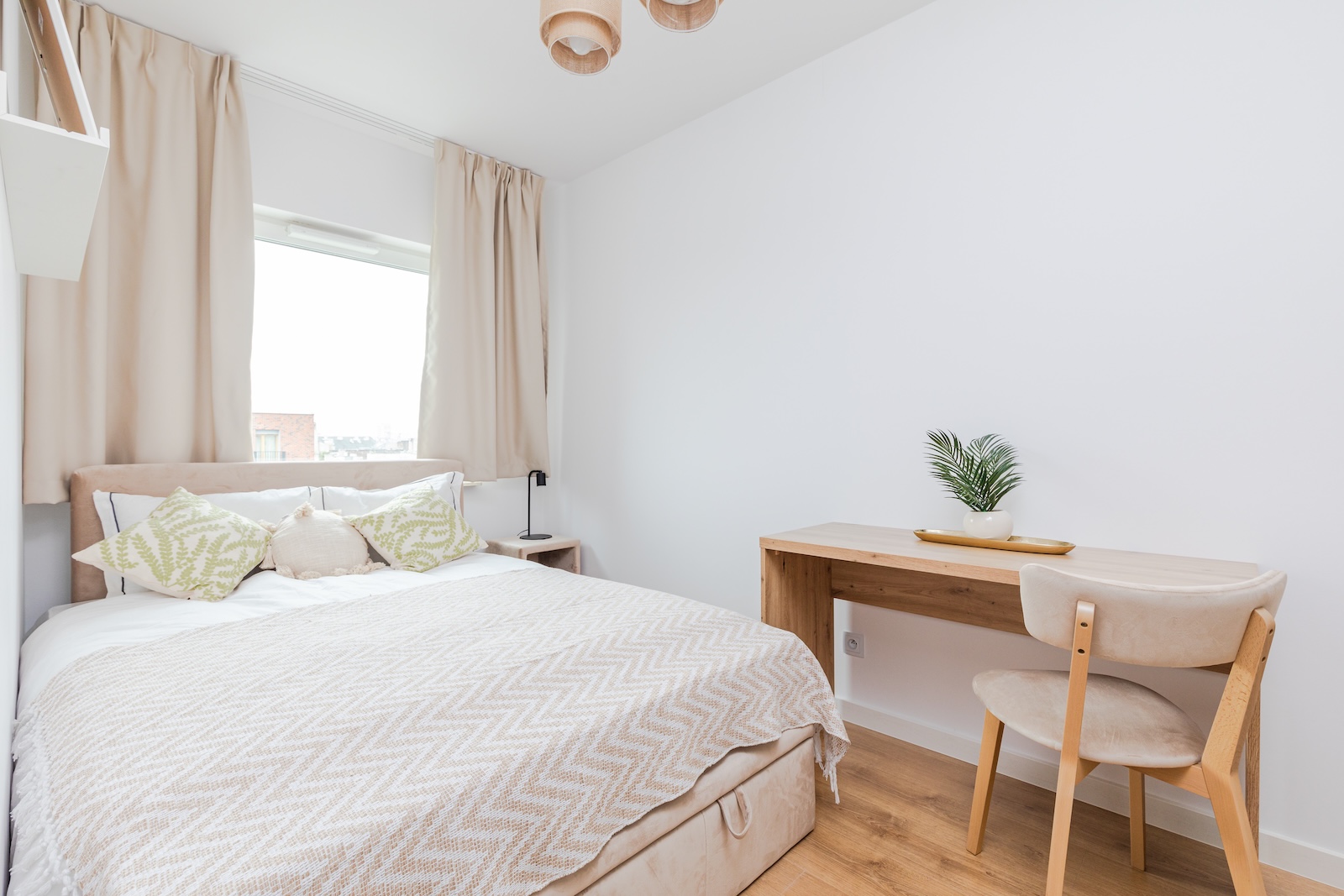 Apartament 2 pokojowy został zaprojektowany z myślą o maksymalnym komforcie – posiada wyraźnie oddzieloną strefę dzienną oraz sypialnianą. Duże okna zapewniają dostęp do naturalnego światła, a balkon pozwala cieszyć się świeżym powietrzem w cieplejsze dni. Kuchnia w nowoczesnej zabudowie wyposażona jest w wysokiej jakości sprzęt AGD: piekarnik, płytę grzewczą, lodówkę z zamrażarką oraz zmywarkę. Przemyślany układ przestrzeni ułatwia codzienne funkcjonowanie, a w łazience znajdziesz prysznic, praktyczne schowki oraz pralkę. W mieszkaniu przewidziano miejsce na przechowywanie rzeczy osobistych, a dodatkową przestrzeń możesz łatwo wynająć w piwnicy. Drewnopodobna podłoga i jasna kolorystyka ścian tworzą przytulną atmosferę. W salonie znajduje się także telewizor. Dla komfortu i bezpieczeństwa mieszkańców, palenie jest zabronione w mieszkaniach, na balkonach oraz na terenie całego budynku. Wydzielono strefę dla palących na zewnątrz.