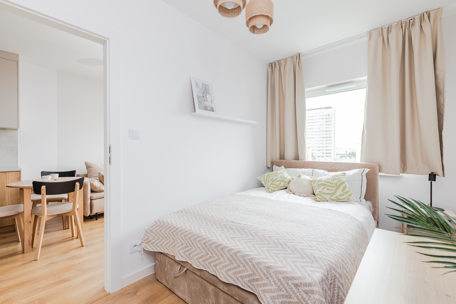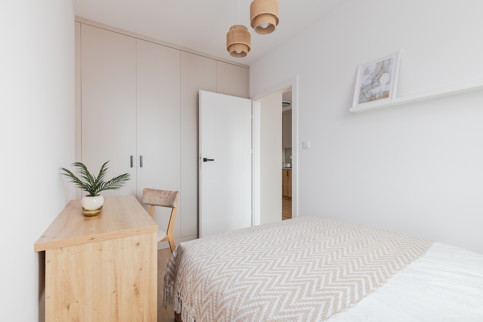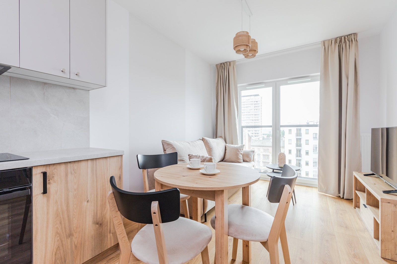 Apartament 2 pokojowy został zaprojektowany z myślą o maksymalnym komforcie – posiada wyraźnie oddzieloną strefę dzienną oraz sypialnianą. Duże okna zapewniają dostęp do naturalnego światła, a balkon pozwala cieszyć się świeżym powietrzem w cieplejsze dni. Kuchnia w nowoczesnej zabudowie wyposażona jest w wysokiej jakości sprzęt AGD: piekarnik, płytę grzewczą, lodówkę z zamrażarką oraz zmywarkę. Przemyślany układ przestrzeni ułatwia codzienne funkcjonowanie, a w łazience znajdziesz prysznic, praktyczne schowki oraz pralkę. W mieszkaniu przewidziano miejsce na przechowywanie rzeczy osobistych, a dodatkową przestrzeń możesz łatwo wynająć w piwnicy. Drewnopodobna podłoga i jasna kolorystyka ścian tworzą przytulną atmosferę. W salonie znajduje się także telewizor. Dla komfortu i bezpieczeństwa mieszkańców, palenie jest zabronione w mieszkaniach, na balkonach oraz na terenie całego budynku. Wydzielono strefę dla palących na zewnątrz.