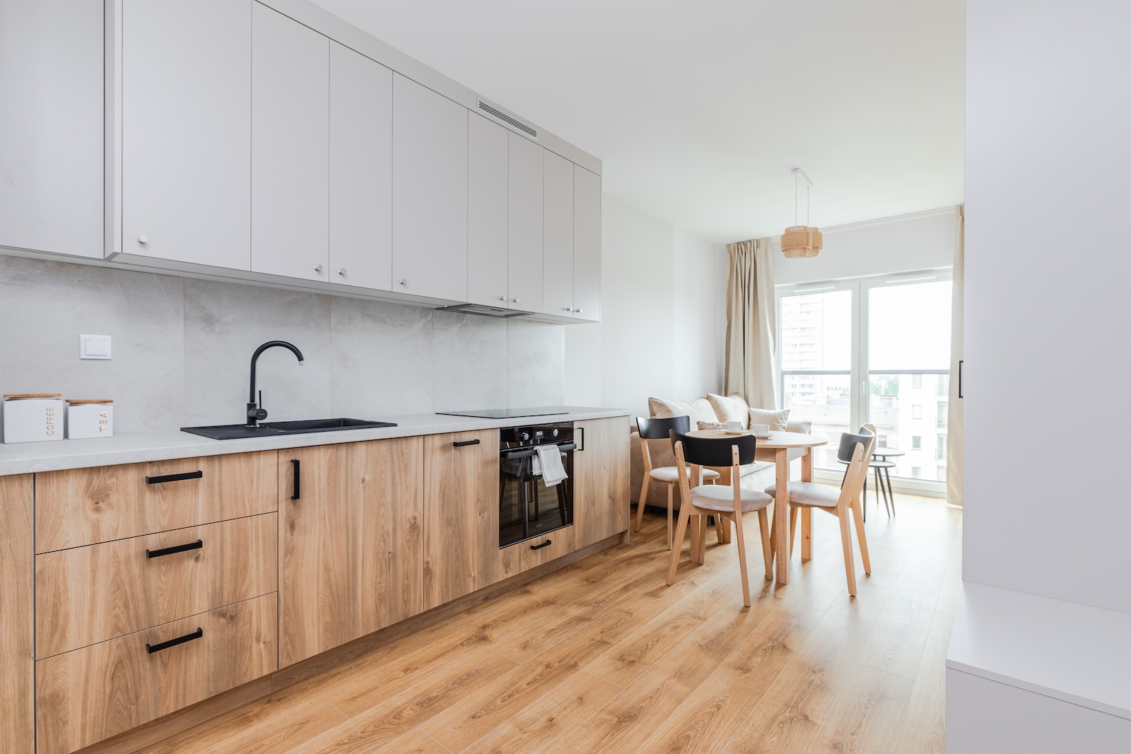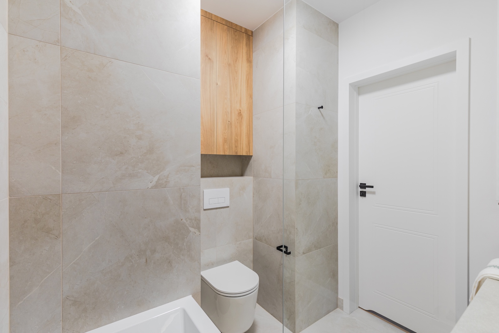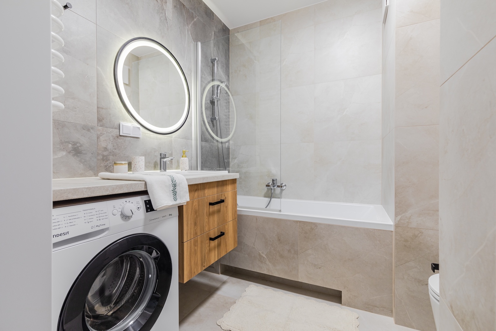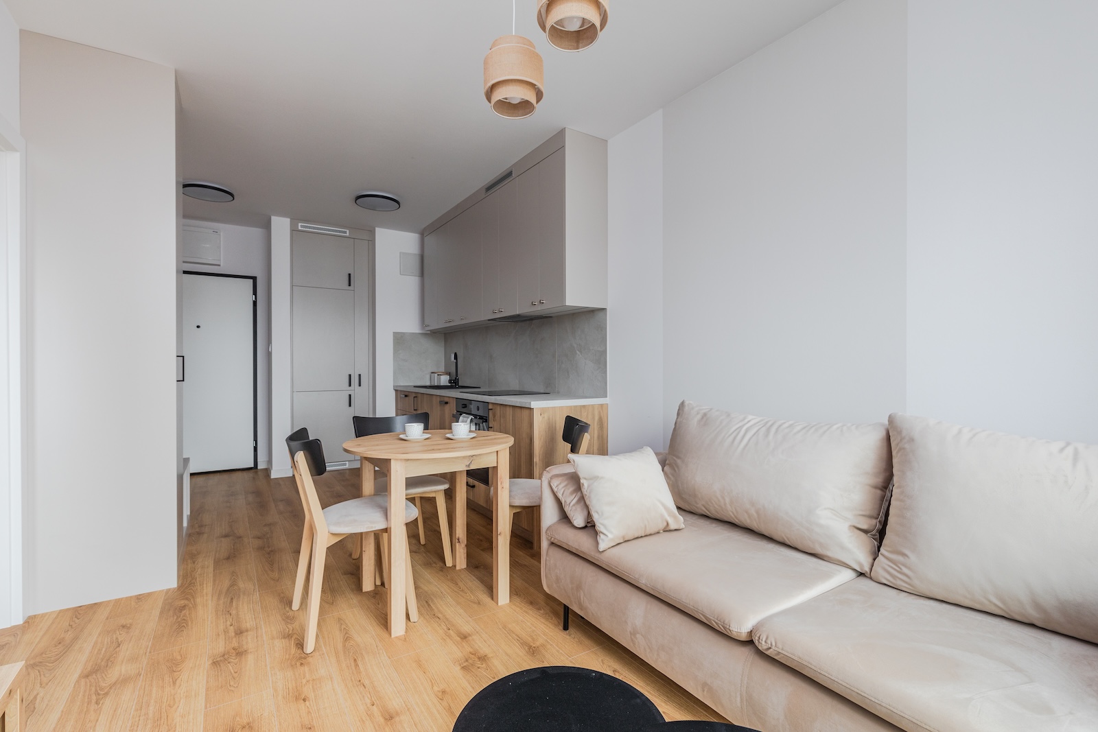 Apartament 2 pokojowy został zaprojektowany z myślą o maksymalnym komforcie – posiada wyraźnie oddzieloną strefę dzienną oraz sypialnianą. Duże okna zapewniają dostęp do naturalnego światła, a balkon pozwala cieszyć się świeżym powietrzem w cieplejsze dni. Kuchnia w nowoczesnej zabudowie wyposażona jest w wysokiej jakości sprzęt AGD: piekarnik, płytę grzewczą, lodówkę z zamrażarką oraz zmywarkę. Przemyślany układ przestrzeni ułatwia codzienne funkcjonowanie, a w łazience znajdziesz prysznic, praktyczne schowki oraz pralkę. W mieszkaniu przewidziano miejsce na przechowywanie rzeczy osobistych, a dodatkową przestrzeń możesz łatwo wynająć w piwnicy. Drewnopodobna podłoga i jasna kolorystyka ścian tworzą przytulną atmosferę. W salonie znajduje się także telewizor. Dla komfortu i bezpieczeństwa mieszkańców, palenie jest zabronione w mieszkaniach, na balkonach oraz na terenie całego budynku. Wydzielono strefę dla palących na zewnątrz.