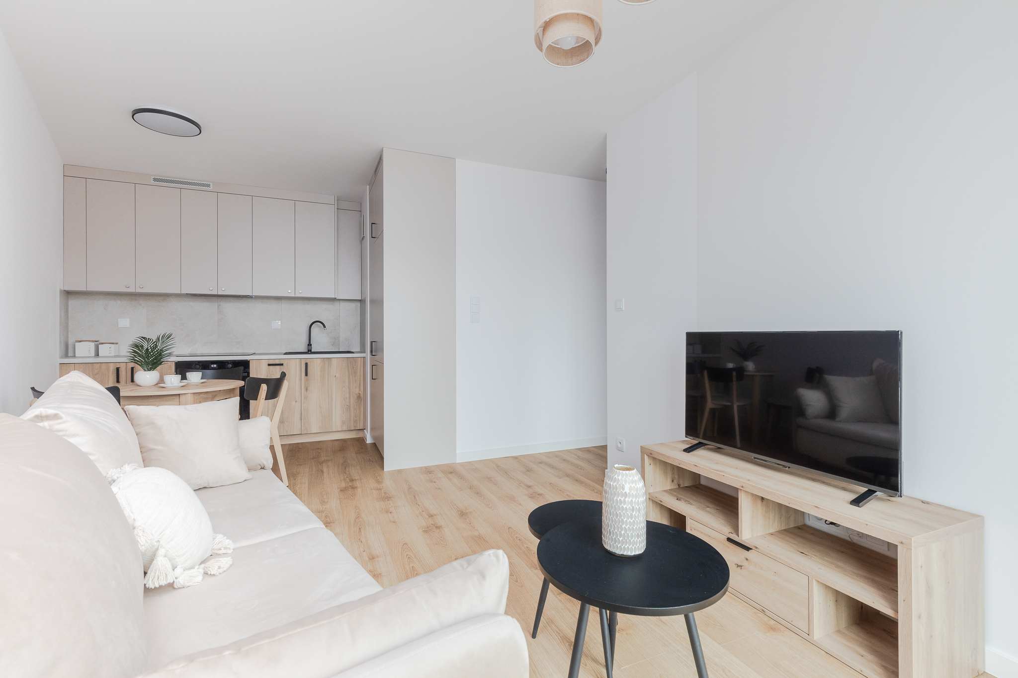 Apartament 2 pokojowy został zaprojektowany z myślą o maksymalnym komforcie – posiada wyraźnie oddzieloną strefę dzienną oraz sypialnianą. Duże okna zapewniają dostęp do naturalnego światła, a balkon pozwala cieszyć się świeżym powietrzem w cieplejsze dni. Kuchnia w nowoczesnej zabudowie wyposażona jest w wysokiej jakości sprzęt AGD: piekarnik, płytę grzewczą, lodówkę z zamrażarką oraz zmywarkę. Przemyślany układ przestrzeni ułatwia codzienne funkcjonowanie, a w łazience znajdziesz prysznic, praktyczne schowki oraz pralkę. W mieszkaniu przewidziano miejsce na przechowywanie rzeczy osobistych, a dodatkową przestrzeń możesz łatwo wynająć w piwnicy. Drewnopodobna podłoga i jasna kolorystyka ścian tworzą przytulną atmosferę. W salonie znajduje się także telewizor. Dla komfortu i bezpieczeństwa mieszkańców, palenie jest zabronione w mieszkaniach, na balkonach oraz na terenie całego budynku. Wydzielono strefę dla palących na zewnątrz.