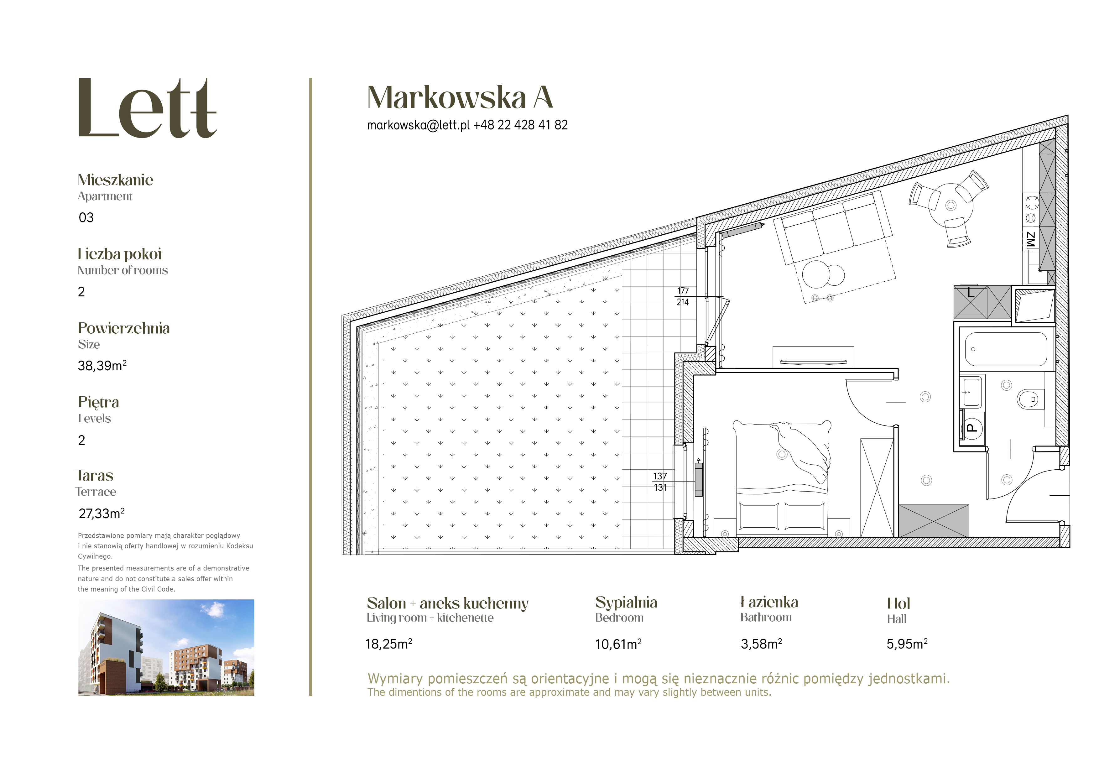 Prezentowane mieszkanie znajduje się w inwestycji Lett Markowska i oferuje nowoczesne miejsce do życia – idealne zarówno na krótki pobyt, jak i dłuższy wynajem. Przy ul. Markowskiej 5 znajduje się aż 179 mieszkań, w tym kawalerki i mieszkania dwupokojowe, w pełni umeblowane i gotowe do zamieszkania.