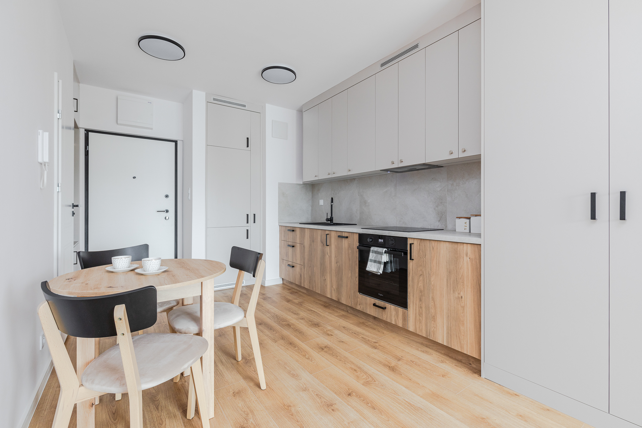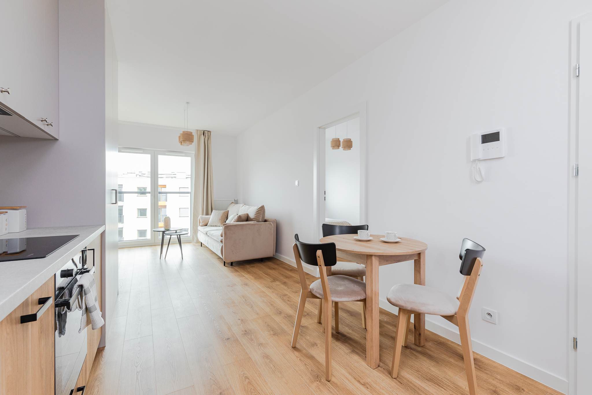 Apartament 2 pokojowy został zaprojektowany z myślą o maksymalnym komforcie – posiada wyraźnie oddzieloną strefę dzienną oraz sypialnianą. Duże okna zapewniają dostęp do naturalnego światła, a balkon pozwala cieszyć się świeżym powietrzem w cieplejsze dni. Kuchnia w nowoczesnej zabudowie wyposażona jest w wysokiej jakości sprzęt AGD: piekarnik, płytę grzewczą, lodówkę z zamrażarką oraz zmywarkę. Przemyślany układ przestrzeni ułatwia codzienne funkcjonowanie, a w łazience znajdziesz prysznic, praktyczne schowki oraz pralkę. W mieszkaniu przewidziano miejsce na przechowywanie rzeczy osobistych, a dodatkową przestrzeń możesz łatwo wynająć w piwnicy. Drewnopodobna podłoga i jasna kolorystyka ścian tworzą przytulną atmosferę. W salonie znajduje się także telewizor. Dla komfortu i bezpieczeństwa mieszkańców, palenie jest zabronione w mieszkaniach, na balkonach oraz na terenie całego budynku. Wydzielono strefę dla palących na zewnątrz.