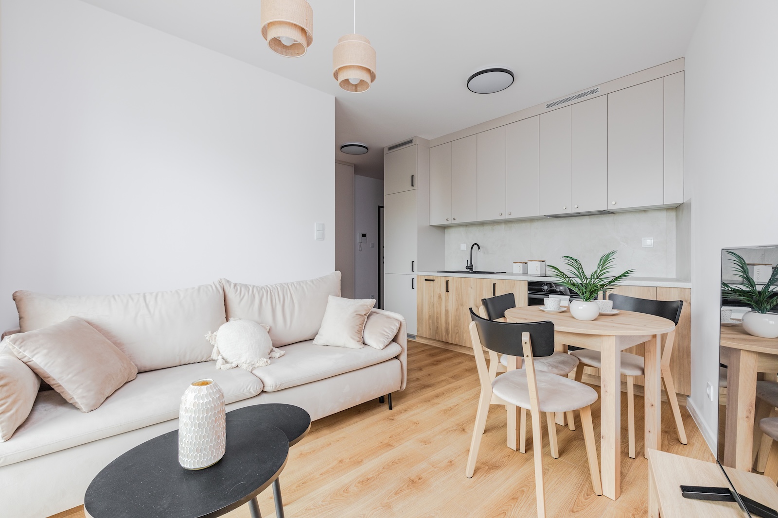 Apartament t2 pokojowy został zaprojektowany z myślą o maksymalnym komforcie – posiada wyraźnie oddzieloną strefę dzienną oraz sypialnianą. Duże okna zapewniają dostęp do naturalnego światła, a balkon pozwala cieszyć się świeżym powietrzem w cieplejsze dni. Kuchnia w nowoczesnej zabudowie wyposażona jest w wysokiej jakości sprzęt AGD: piekarnik, płytę grzewczą, lodówkę z zamrażarką oraz zmywarkę. Przemyślany układ przestrzeni ułatwia codzienne funkcjonowanie, a w łazience znajdziesz prysznic, praktyczne schowki oraz pralkę. W mieszkaniu przewidziano miejsce na przechowywanie rzeczy osobistych, a dodatkową przestrzeń możesz łatwo wynająć w piwnicy. Drewnopodobna podłoga i jasna kolorystyka ścian tworzą przytulną atmosferę. W salonie znajduje się także telewizor. Dla komfortu i bezpieczeństwa mieszkańców, palenie jest zabronione w mieszkaniach, na balkonach oraz na terenie całego budynku. Wydzielono strefę dla palących na zewnątrz.